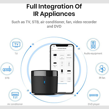 【HIGH COMPATIBILITY】: BroadLink RM4 mini Wi-Fi smart hub supports 50,000+ IR controlled devices with full integration of home entertainment and electric appliances, such as TV, STB, Video Recorder, DVD, Presenter Remote, Home Theater/Sound Bar control, Air Conditioner, Fan, etc. Supported IR library is constantly being updated by the cloud to ensure newer devices are always compatible. Option to program the ir remote devices and learn buttons if no available cloud data is matching with.